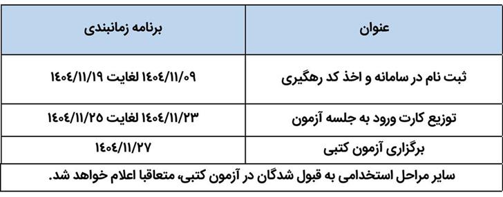 4. انجام خدمت نظام وظیفه عمومی و یا معافیت دائم. تاریخ پایان خدمت وظیفه و یا صدور کارت معافیت دائم می بایست حداکثر تا روز آزمون کتبی (قبل از تاریخ 27/11/1404) باشد.