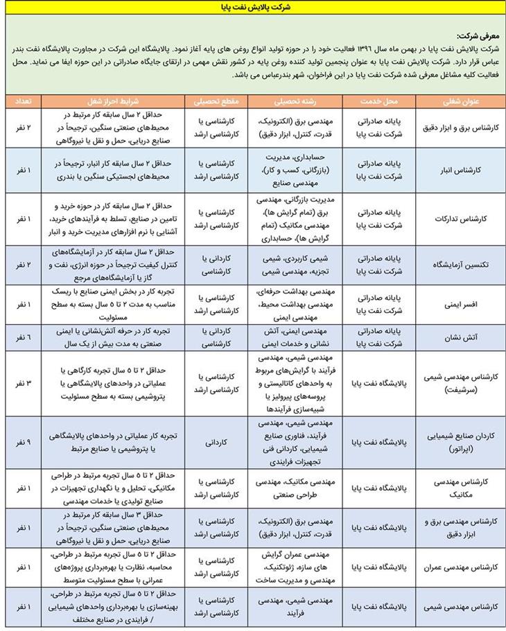 به منظور جذب 29 نفر نیروی انسانی مورد نیاز شرکت پالایش نفت پایا واقع در شهر بندرعباس از بین آقایان واجد شرایط از طریق برگزاری آزمون کتبی، مصاحبه تخصصی و سایر مراحل گزینش دعوت به همکاری می گردد.